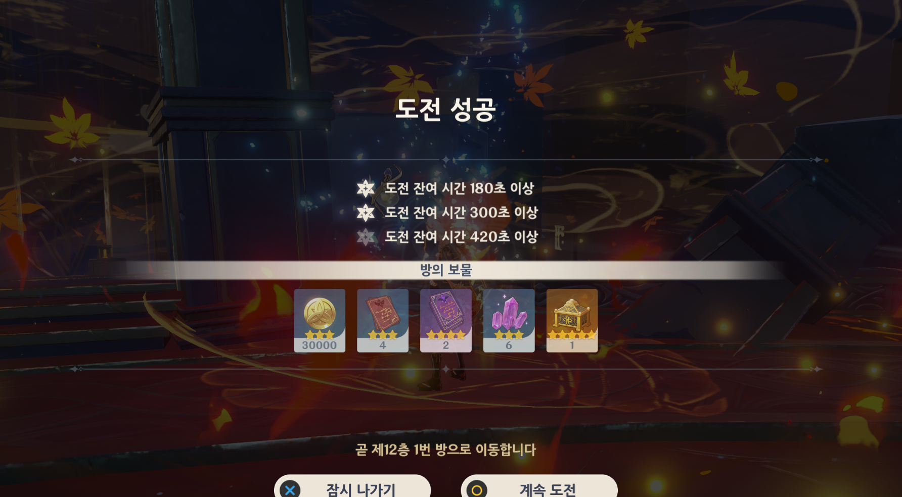 바로 그 다음 나선 비경도 도전해봤는데 이거 방 배치 잘못해버렸네.. 만개 파티를 2번방 주고 1번방에 향카베로 돌려야겠다. (+ 파티 구성 다시했더니 이번에도 12번방 1별까지는 달성!)