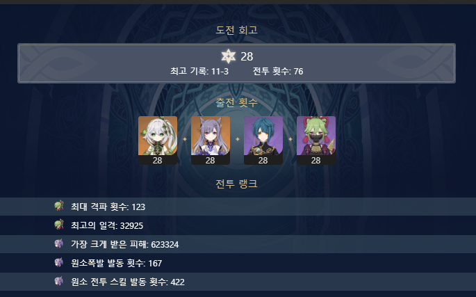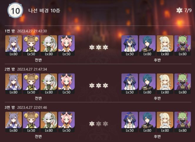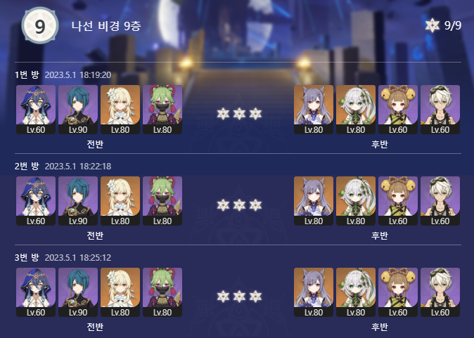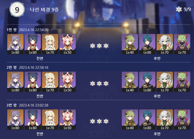 우선 4.16 ~ 5.01 까지 진행된 나선 비경의 전적이다.