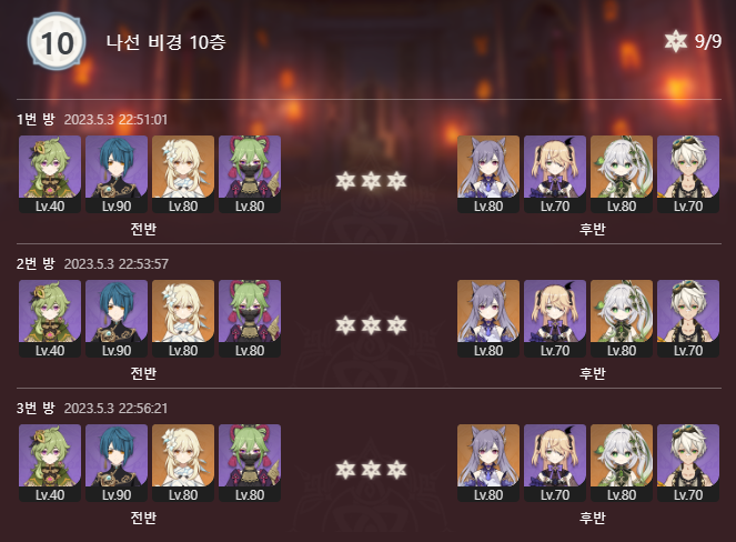 10층은 전반이 도저히 딜이 안되어서 나히다를 각청이랑 붙이고 촉진 반응으로 잡아냈다. 너무 잘 죽어서 아직 덜 키웠지만.. 요요를 데려와 전반부를 무사히 깼다. 후반의 경우 행추랑 시노부의 90프로 활약에 풀행자가 종종 개화를 만들어서 잘 진행되었다. (이거 행추 시노부에 풀 아무거나 끼워도 상당히 딜은 잘 나왔던 것 같다.)