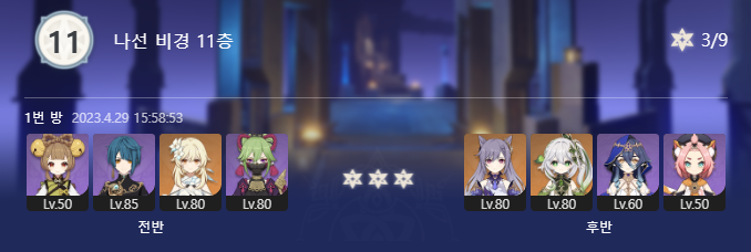 11층은 개화 반응이 너무 안 일어나서 전반부는 요요랑 풀행자에 행추 시노부 붙여서 최대한 나히다의 빈자리를 메꿔보고자 했다. 후반의 경우는 각청 나히다에 레일라랑 디오나로 최대한 위험 요소를 좀 줄이고자 했다. 어찌저찌 3별은 했네 ㅎㅎ