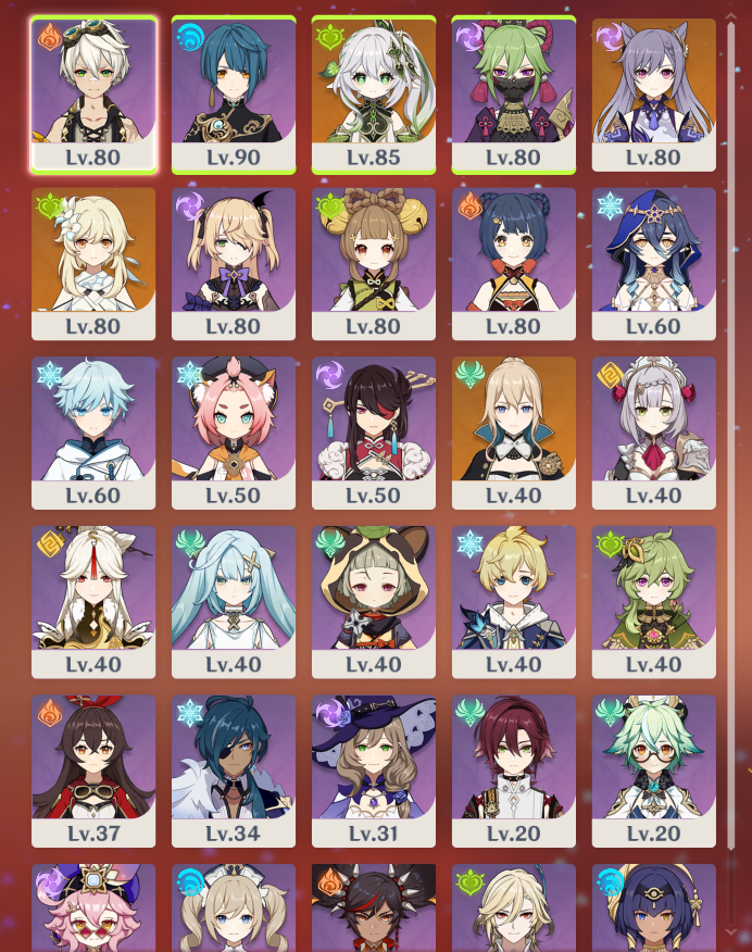 나선 비경 돌았을 때 보다 전반적으로 사용하는 캐릭터들 레벨도 좀 더 올리고 특성이나 성유물도 이전보다는 더 갖춘 상태이다. 아직 두 파티를 완전히 만들 수 있는 캐릭터 풀은 아니다. 앞으로 꾸준히 하면서 캐릭터도 더 모으고 파티 덱도 더 다양하게 구성할 수 있기를 기대한다!