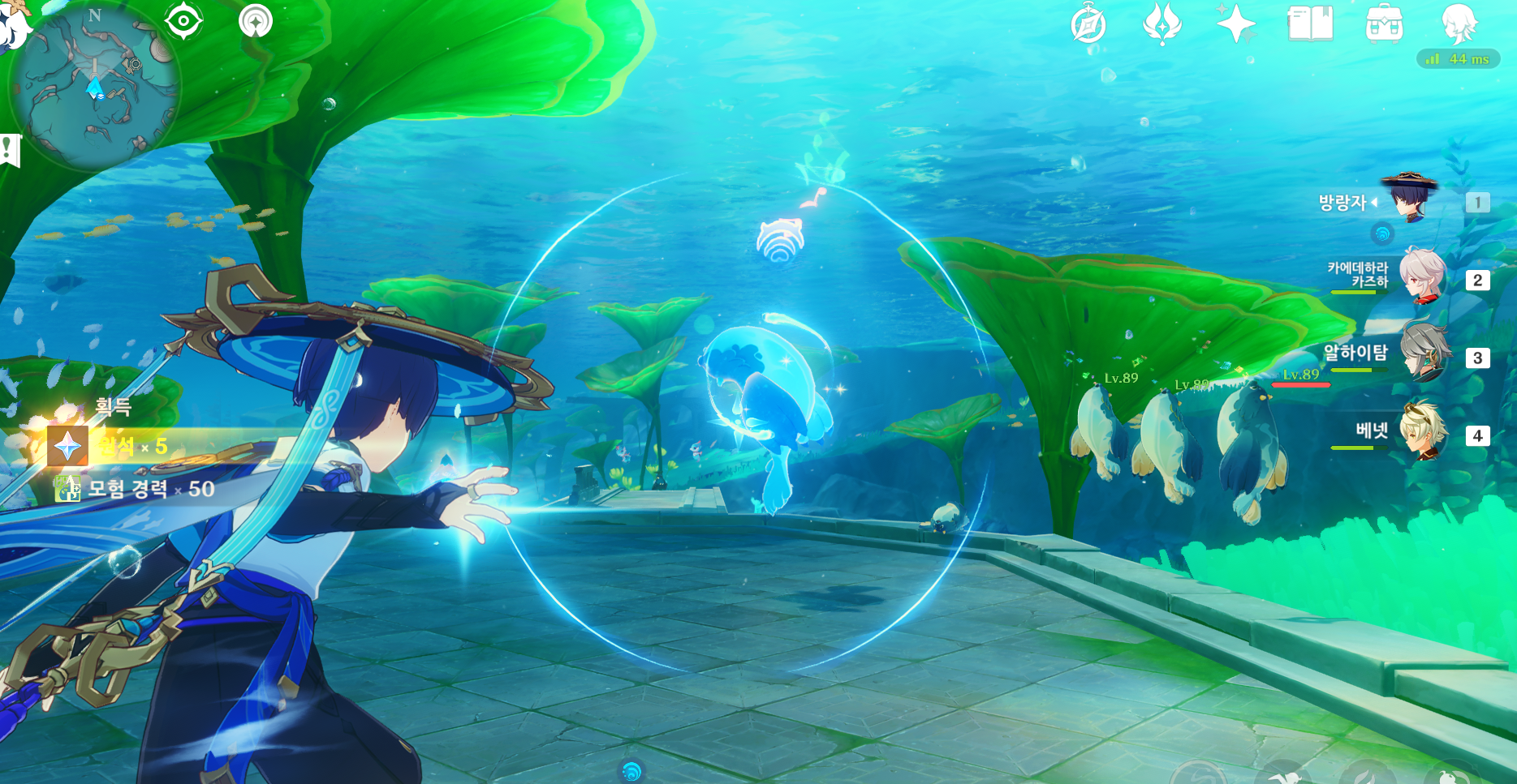 원래 캐릭터들의 원소 스킬을 썼다면 이제는 스킬이 전체로 통일된다. 스킬 자체는 폰타인 맵에서 스킬을 주는 개체와 상호작용을 해서 얻어오는 형식이다. (공격력은 캐릭터들 공격력 반영인지 아니면 모두 그냥 동일한 값으로 주는건지는 아직 잘 모르겠다.)