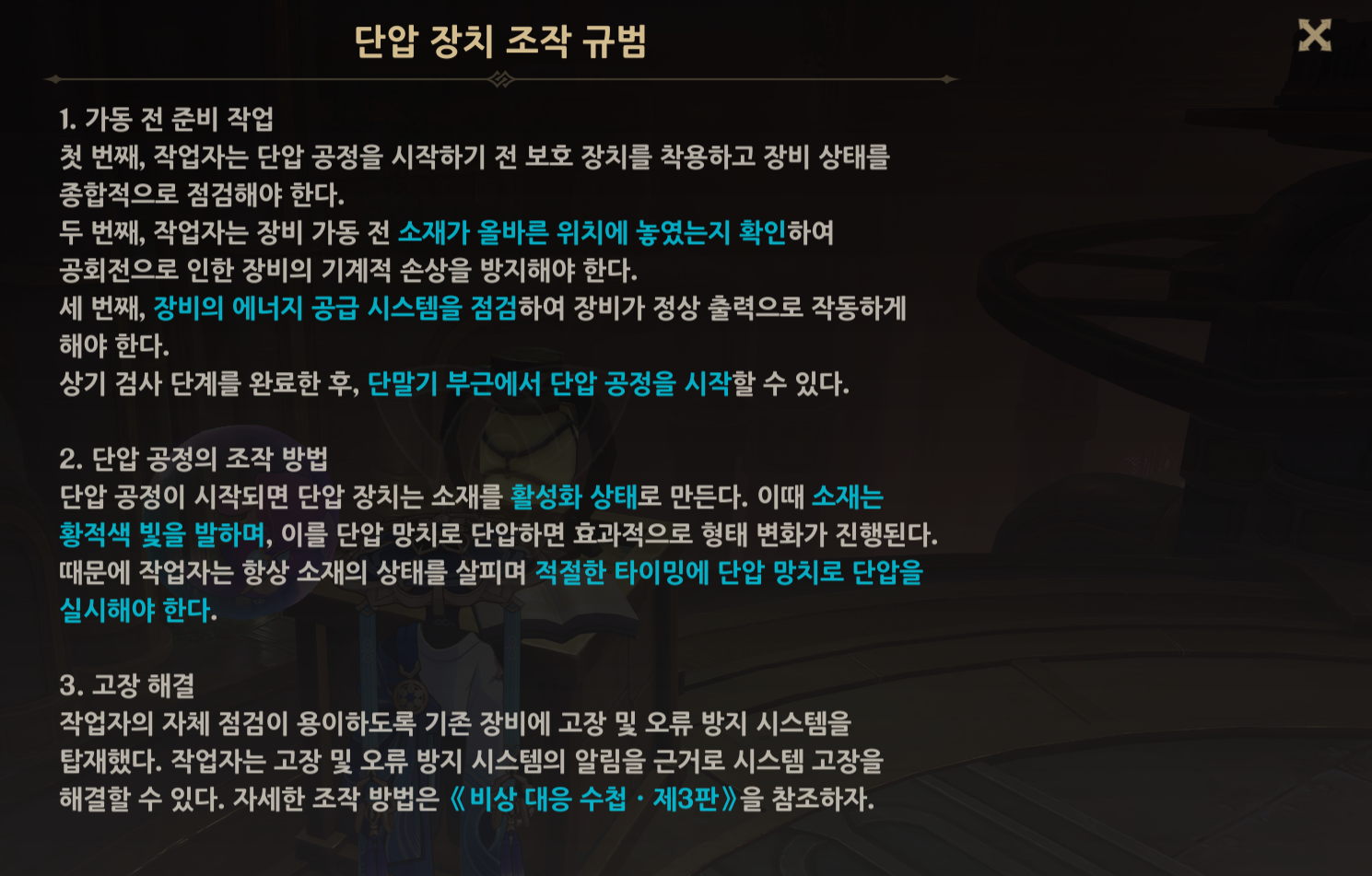 마지막 단압은 텍스트 색상이 노란색으로 변한다. 단압이 끝나면 애니메이션이 재생되고 물이 차오르며 빛나는 아르케 광석 결정을 얻을 수 있다.